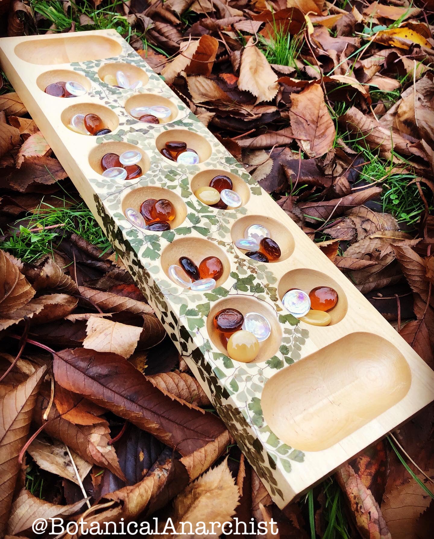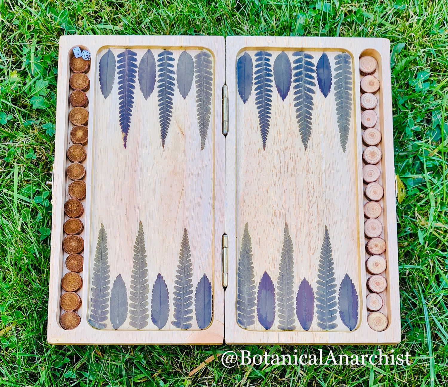 Botanical backgammon board pressed leaves (ferns & pink veronica flowers) - cottagecore goblincore unique art from nature